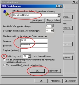 Wählen Sie Ihre DFÜ-Verbindung aus. Geben Sie Ihre Benutzerdaten ein. Selektieren Sie